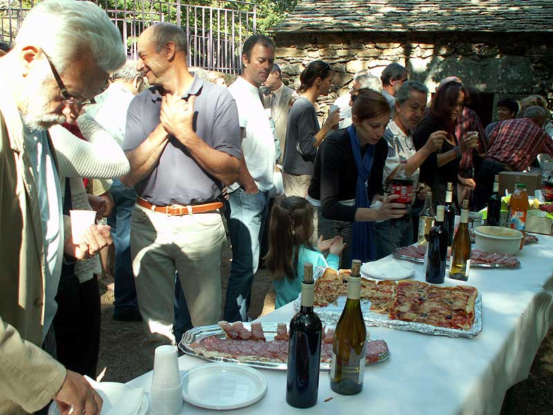 Le temps s’y prêtant magnifiquement, les instants champêtres de cette inauguration ont été soulignés par un solide buffet déjeunatoire aux accents d’un terroir que nous connaissons bien. Le moulin, tout pimpant et bien rafraîchi, a présidé à ces instants réjouissants. Une fois seul, solidement assis sous les frondaisons de hêtres et de frênes face à un ruisseau aux eaux toujours changeantes, peut-être se gratte-t-il la lauze en se remémorant l’odeur des grains, le charroi des sacs de farine et les anecdotes paysannes qui furent sa véritable existence. Il est vrai, qu’aujourd’hui, il a pris une longue et solide retraite au cours de laquelle il va pouvoir se raconter à ses visiteurs. Les grains ne sont plus là, la meule est inerte et partielle. Plus robuste que lui, la vie continue…